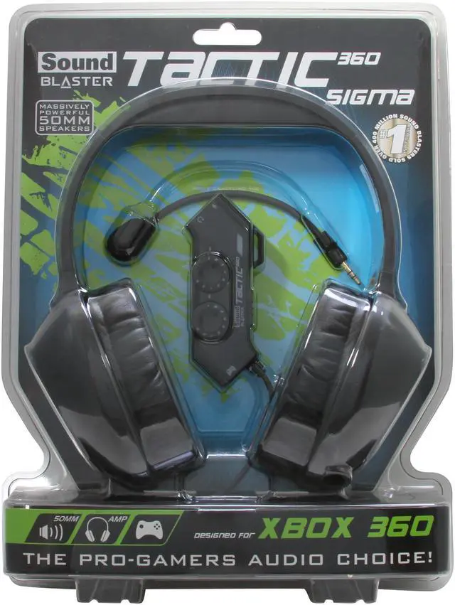 | Features | The pro-gaming audio choice for the Xbox 360! The Sound Blaster Tactic360 Sigma pro-gaming headset now lets Xbox 360 users experience the legendary Sound Blaster quality audio that PC gamers have enjoyed over the years. The inline stereo amplifier coupled with the Tactic3D headset equipped with powerful 50mm FullSpectrum Speakers deliver high-powered, heart-pounding gaming audio, along with crystal clear voice communication over Xbox LIVE. Powered by the Xbox 360, the stereo amplifier unit features individual voice and audio controls so you can take complete control of what you want to hear while gaming. There's no better time than now to take your gaming audio to the next level! Inline stereo amplifier with independent audio and chat controls Conveniently powered via your Xbox 360's USB port, the inline stereo amplifier comes with integrated volume controls to adjust both game audio and incoming chat levels separately, letting you hear what matters to you most. 50mm FullSpectrum Speakers A high-powered, no holds barred gaming audio experience with massive bass and detailed highs - exactly how the game designers want you to experience the game. Detachable noise-cancelling microphone The noise-cancelling microphone with chat volume control lets you communicate clearly while chatting over Xbox LIVE, and can be detached when not gaming or using voice audio. Great gaming audio wherever you play The extra long tangle-free cable allows you to enjoy great gaming audio whether you're at your desk or lounging on the couch. Detachable headset Works with PC or Mac too Disconnect the inline stereo amplifier and the versatile headset can be used as a powerful gaming headset for your PC or Mac as well. Over 400 million Sound Blasters sold Experience the difference of real audio expertise. The industry standard for audio quality on the PC is now also available for the Xbox 360. |