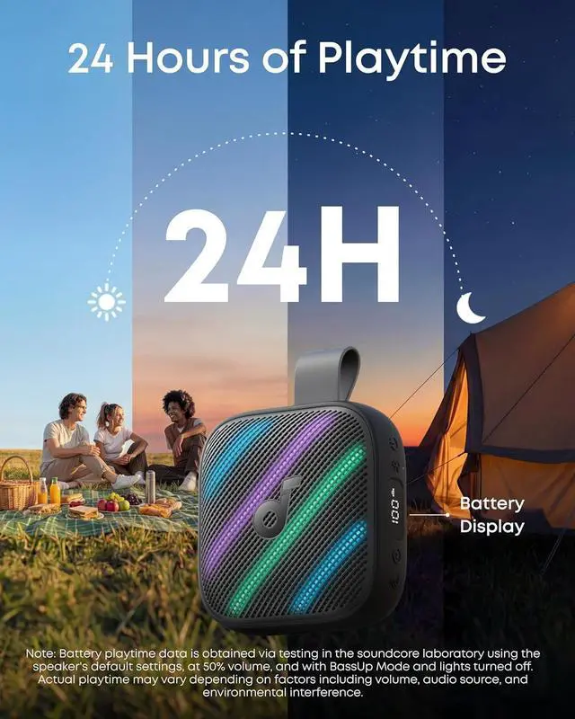 24-Hour Battery with Battery Display: This portable speaker delivers 24 hours playtime on a single chargeperfect for outdoor activities from sunrise to sunset. Plus, the real-time power display shows the exact battery level so you never get caught off guard by low power.