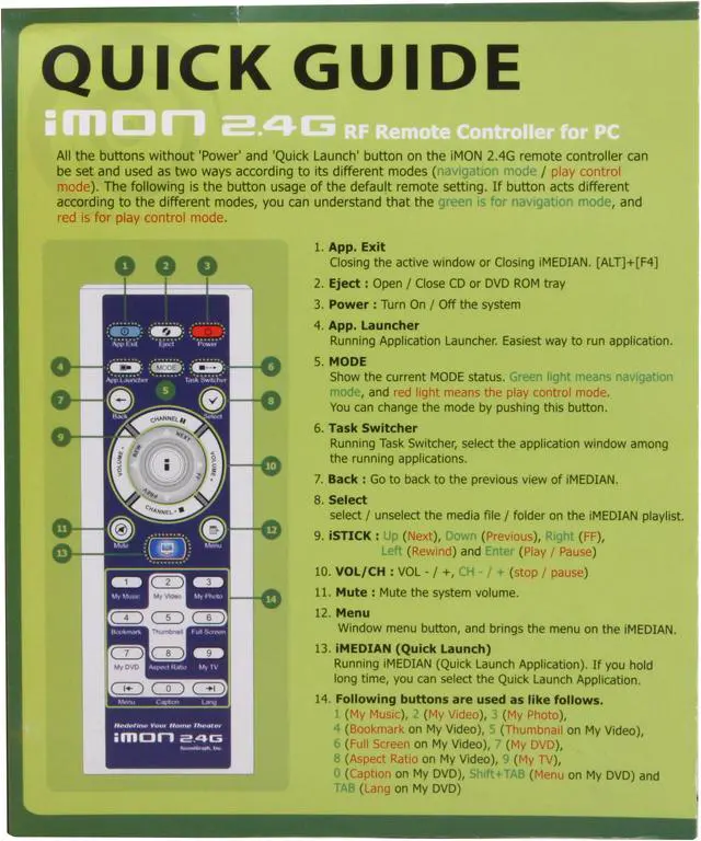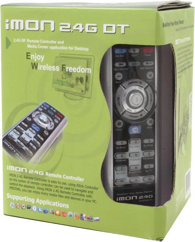 | Features | iMON 2.4G DT is the internal type RF receiver which could fits to the PCI slot of PC. The different point with the external model, iMON 2.4G LT is that iMON 2.4G DT support the remote PC power on feature. In order to support the power on feature, iMON 2.4G DT is connected to the PCI slot and be supplied standby power from the main power supply. The detail installation method of iMON 2.4G DT is shown on the below. Two USB cables are supplied to connect to the internal mainboard USB pin or to connect to the external USB port. As like the external model, 2.4GHz RF signal can pass through the obstacle as like the wall and furniture. And with the iMEDIAN supplied with remote controller, you can enjoy the media files on your PC at anywhere in your home. The iMON 2.4G remote controller and USB RF receiver using the secret ID code and make a pairing one by one, so it is possible to use several remote controllers and receivers in the same space and there is no compatibility issue with wireless network and other wireless devices. PC Power On feature using iMON 2.4G remote controller Compact size for PCI slot (support low profile bracket for slim size PC) High RF signal sensitivity Connection Type: Internal or External USB |