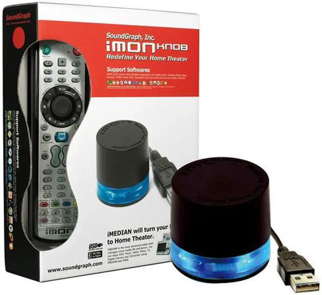 | Features | iMON Knob is our new external IR receiver, and it is designed to be used as not only IR receiver but also volume controller. It could be attached on the font panel of PC or on the top of the desk and it could be used as not only IR receiver but also volume controller. Volume Controllability (Up/Down and mute) Slim and cute design to be attached on the PC font panel High IR sensitivity Polite blue LED on the bottom line Connection Type: External USB Cable (5.9"), Extension Cable (4.9') |