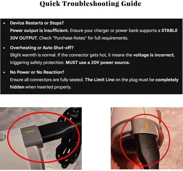 - Ensure Stable Power Supply: Please confirm that your power source consistently outputs 20V or higher for optimal performance.
