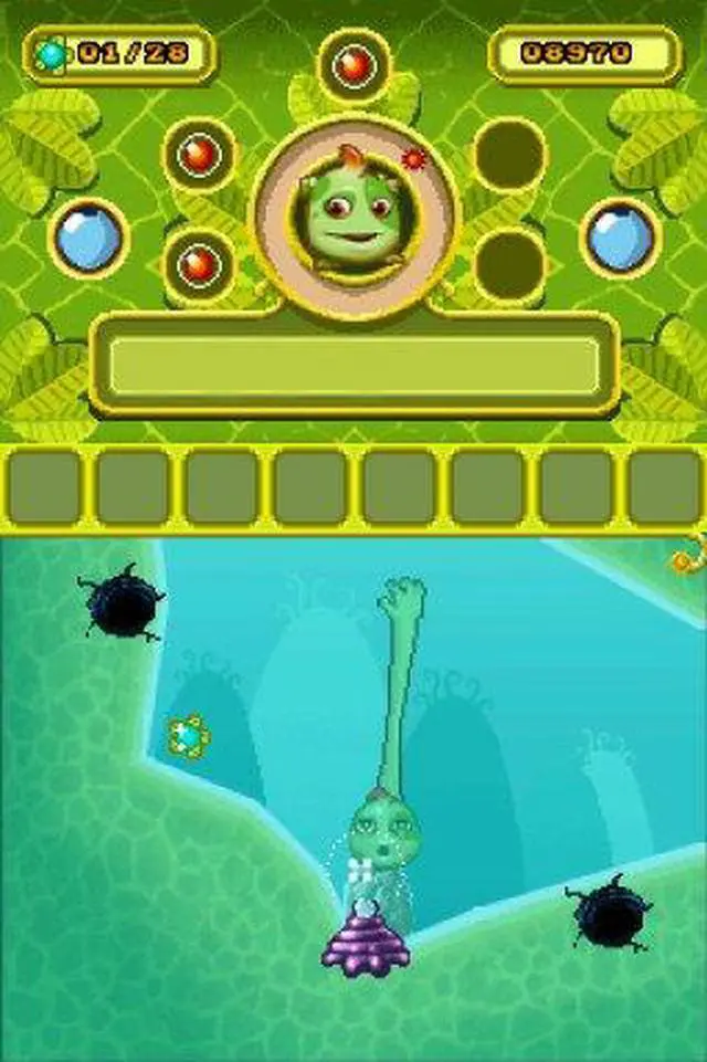 | Features | As the young but determined hero Mr. Slime, players set off on an exhilarating adventure, trying to protect Slime Village from its evil enemies, the Axons. Using the touch screen and stylus, players must navigate the levels by dragging and stretching Mr. Slime's arms to grab hold of small anchor points scattered throughout the game. Mr. Slime features inventive uses of characteristics specific to Nintendo DS, including sound and shape recognition. As an example, players are able to blow on Mr. Slime to make him fly in the air or to help him breathe under water. 5 Worlds: The adventure is divided into 5 different worlds 40 levels: Each world is divided into 8 levels 40 traps/mechanisms: 8 different kinds of traps/mechanisms for each world 9 engine-based narrative animations 3 cinematics Voice recognition: In the air, you can blow in the microphone and you will create an air stream Mr. Slime can use to fly. Under water, blow and you will help him breathe. |