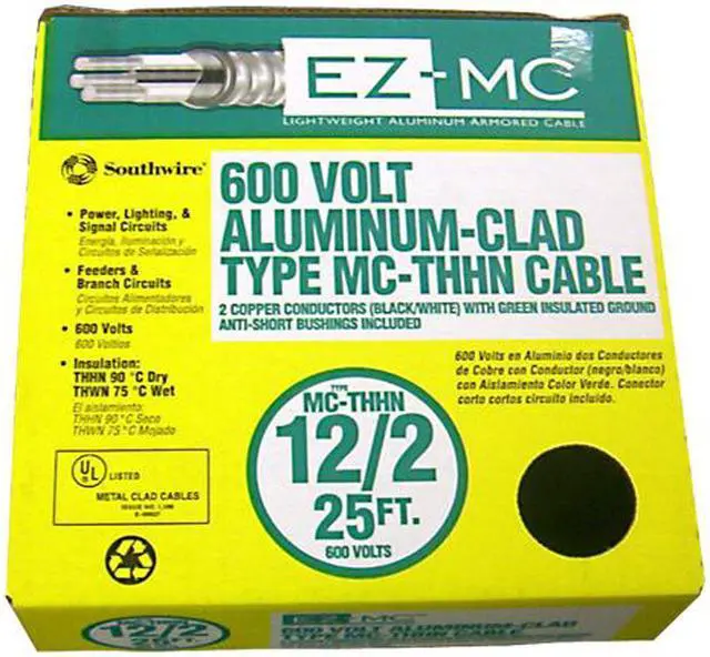 Southwire 12/2 Aluminum Armored Cable - Aluminum armored cable with a dedicated green ground wire. Used for branch, feeder, power, lighting control, signal circuits, and service power distribution in commercial, industrial, institutional, and multiresidential buildings. Also for aerial cable on a messenger, cable trays, and approved raceways. - Length: 25', Size: 12 AWG, Type: MC Cable, Number of Conductors: 2 Conductors, Conductor Material: Copper, Conductor Type: Armored, Jacket Material: Aluminum, UL Listed: Yes, Pkg Qty: 1, Package Type: Shrink Wrap Cancer -