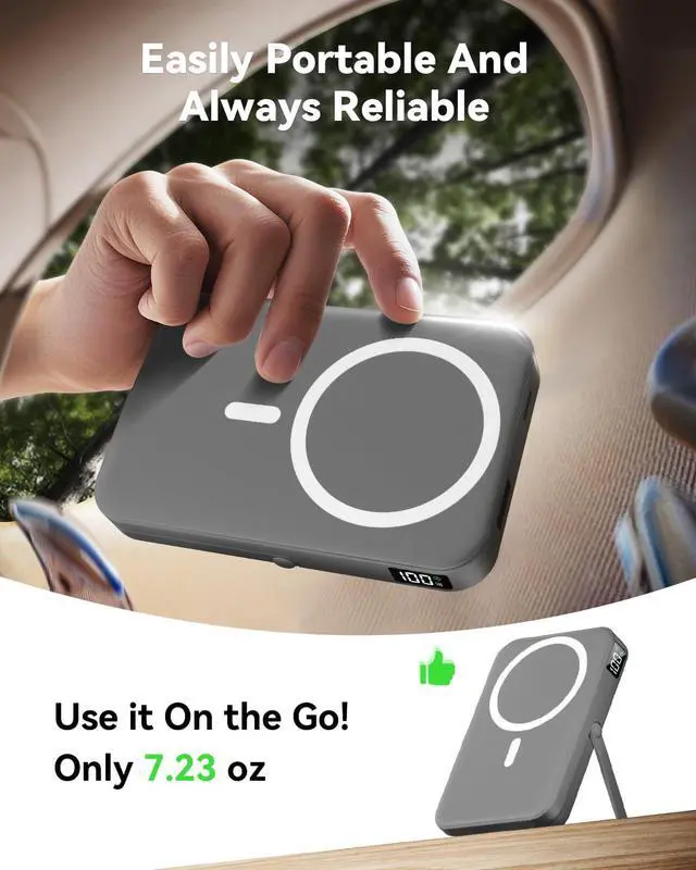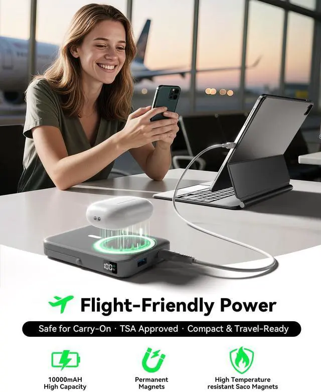 Slim and Portable for TravelUltra-slim for magsafe power bank fits easily into your pocket or handbag,making it the ideal portable charger for iPhone 15/14/13/12 series.With 10000mAh capacity,its approved for carry-on during flights and perfect for work,travel,or outdoor adventures.The matte anti-fingerprint finish adds a clean,professional look to this wireless charger,keeping it stylish wherever you go.