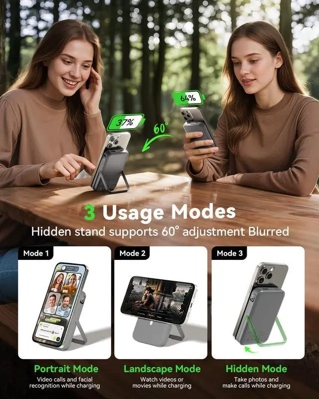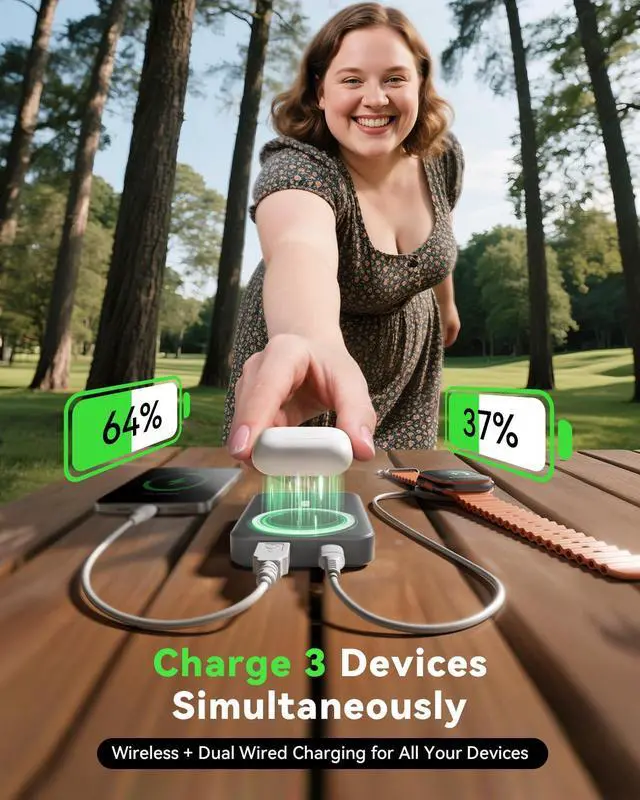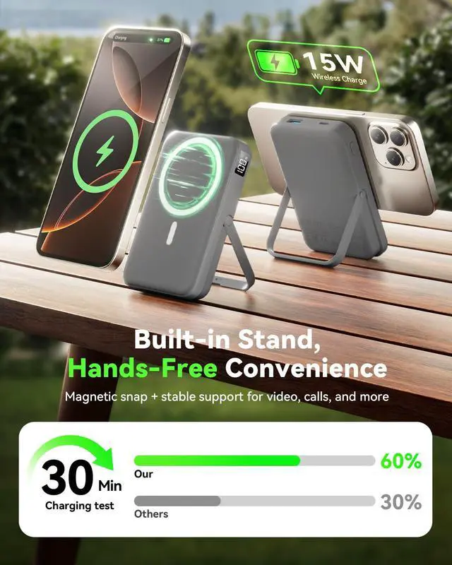 22.5W Fast Charging with 10000mAhEquipped with USB-C PD 20W fast charging output and USB-A 22.5W output,this wireless power bank can charge your iPhone up to 60% in just 30 minutes.The 10000mAh high-density lithium polymer battery offers up to 2 full charges for most iPhonesperfect for travel,daily use,or emergencies.