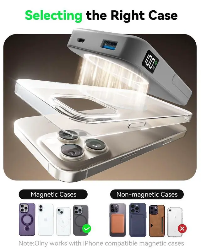 Strong Magnetic Charging for MagSafeSnap and go with powerful built-in N52 magnets that align perfectly with iPhone 16/15/14/13/12 series.Designed for MagSafe battery pack use,ensuring secure,stable wireless charging even when you're on the move.No slipping,no repositioningjust effortless wireless power on the back of your iPhone.