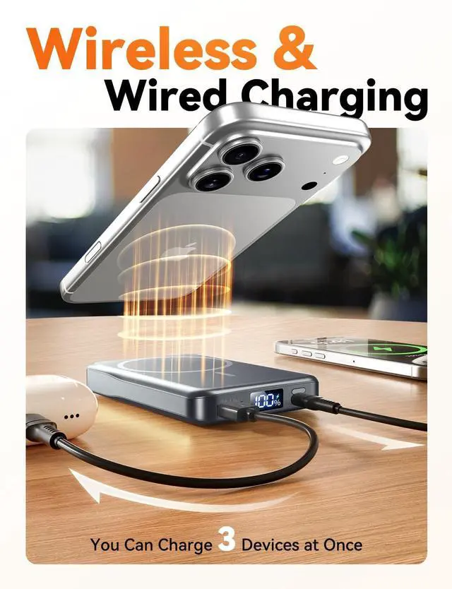 Dual Fast-Charging Ports 15W Wireless & 20W Wired Output for Versatile Use: This portable charger delivers flexible power with 15W wireless charging and fast 20W wired output through USB-A and USB-C. It efficiently powers smartphones, tablets, earbuds, and more. Whether charging multiple devices at once, it offers strong performance, shorter waiting times, and stable current management for daily use.