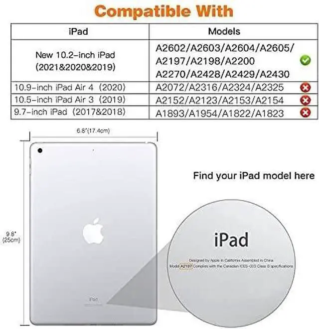 Designed for 10.2-inch iPad 9th Generation 2021(A2602, A2604, A2603, A2605), iPad 8th Generation 2020(A2270, A2428, A2429, A2430), and iPad 7th Generation 2019(A2197, A2198, A2200), facilitate your work and leisure.