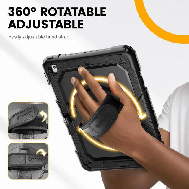 MULTI-ANGLE FUNCTIONALITY: 360° rotating stand with 5 positions for video calls, notes, or viewing; Detachable shoulder strap for commutes; Anti-slip hand strap secures during outdoor work; Dedicated pencil holder for hiking/transport