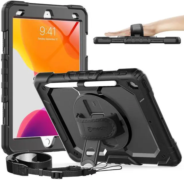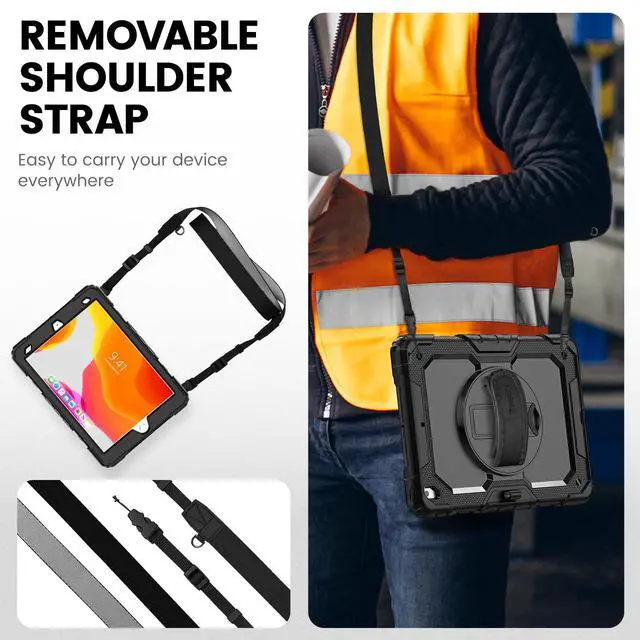 Case for iPad 9th/ 8th/ 7th Generation 10.2 inch - Heavy Duty Protective Cover with Screen Protector, Rotating Stand, Shoulder Strap & Pencil Holder | Kids-Friendly (Black)
