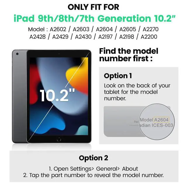 Only fits for iPad 9th/ 8th/ 7th Generation 10.2 inch (Model: A2602 A2603 A2604 A2605 / A2197 A2198 A2200 / A2270 A2428 A2429 A2430); please check the model number on the back of your tablet (''Axxxx'') before purchase.