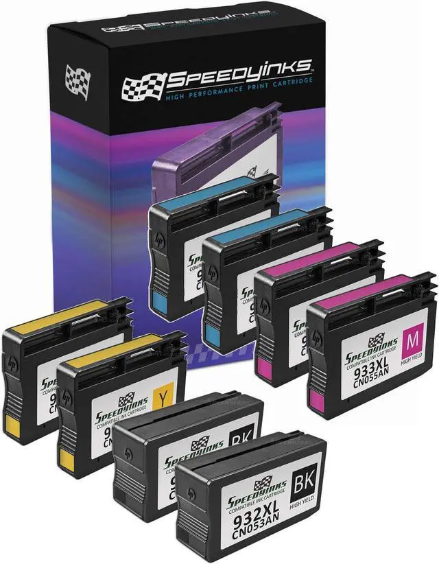 This Remanufactured bulk set of 8 HP 933XL includes Two (2) of each of the following cartridges: CN053AN Black, CN054AN Cyan, CN055AN Magenta, and CN056AN Yellow. All cartridges show accurate ink levels. These Remanufactured HP cartridges will work in the following