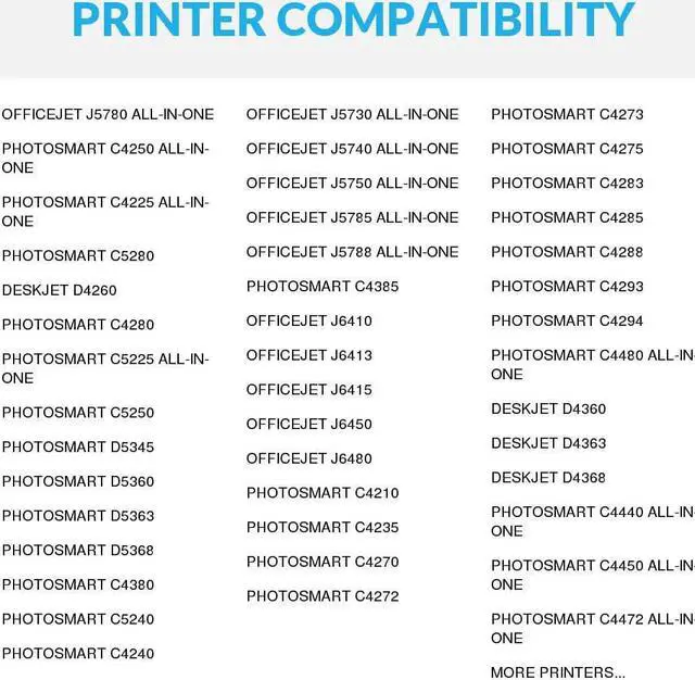 For the following printers: OfficeJet J5783, PhotoSmart C4343, Deskjet D4360, PhotoSmart C5280, OfficeJet J5790, OfficeJet J5725, PhotoSmart C5288, PhotoSmart C5275, PhotoSmart C4383, PhotoSmart C4342, OfficeJet J6424, PhotoSmart C5580, PhotoSmart C4440, PhotoSmart C4280, OfficeJet J5780, OfficeJet J5738, PhotoSmart C4588, PhotoSmart C4575, PhotoSmart C4348, PhotoSmart C4344, OfficeJet J5735, PhotoSmart C4450, Deskjet D4260, PhotoSmart C4250, Deskjet D4280, PhotoSmart C4210, OfficeJet J5750, PhotoSmart C4400, PhotoSmart C5550, PhotoSmart C4599, PhotoSmart C4483, OfficeJet J5730, PhotoSmart C5240, PhotoSmart C4380, PhotoSmart C5250, PhotoSmart C52801, PhotoSmart C4435, PhotoSmart C5540, PhotoSmart C4485, PhotoSmart C4472, Deskjet D4363, PhotoSmart C4480, PhotoSmart C4288, PhotoSmart C4270, OfficeJet J6480, OfficeJet J6413, OfficeJet J6410, OfficeJet J5740, PhotoSmart C4240, PhotoSmart D5360, PhotoSmart C5283, PhotoSmart C4550, PhotoSmart C4345.. Our remanufactured ink cartridges are not remanufactured by HP. We offer a One-Year 100% Quality Satisfaction Guarantee on our remanufactured ink cartridges.