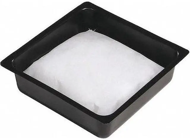 Absorbent Drip Pan with Sorbent Pillow, Bottom Inside Dimensions 10 1/2 L in x 10 1/2 in W, Bottom Inside Length 10 1/2 in, Bottom Inside Width 10 1/2 in, Color Black/White, Cover Material Polyethylene, Dimensions 10 1/2 in L x 10 1/2 W in x 3 in H, Filler Material Poly Blend, Fluids Absorbed Oils, For Use With Chemical or Metal Type Oil, Height 3 in, Includes (12) Pans, (24) Pillows, Indoor/Outdoor Use Indoor, Outdoor, Length 10 1/2 in, Neutralizing No, Outside Skin Material Polypropylene.