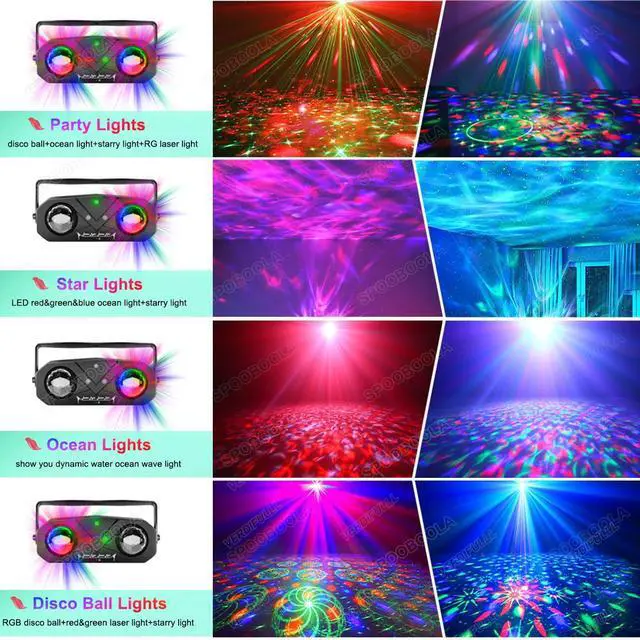 The 5 in 1 party light consists of disco ball light, laser light, and ocean light?star light.You can choose the scene mode you want. Bring a colorful light feast to your parties festival Decorations