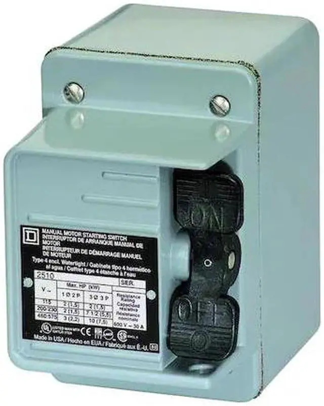 Manual Motor Starter, Horsepower @ Single Phase - 120V AC 1 hp, Horsepower @ Single Phase - 240V AC 1 hp, Maximum Voltage Rating 277V AC, Number of Poles 1, Operator Toggle Switch, Phase Single, Current AC 16 A, Series Class 2510 F Series, Maximum Overload Relay Current Setting Not Applicable, Minimum Overload Relay Current Setting Not Applicable, NEMA Enclosure Rating 4, Number of Required Thermals 1, Overload Protection Type Thermal, Starter Style NEMA, Terminal Connection Type Screw Terminals. This item has been restricted from sale in the following state (s): []