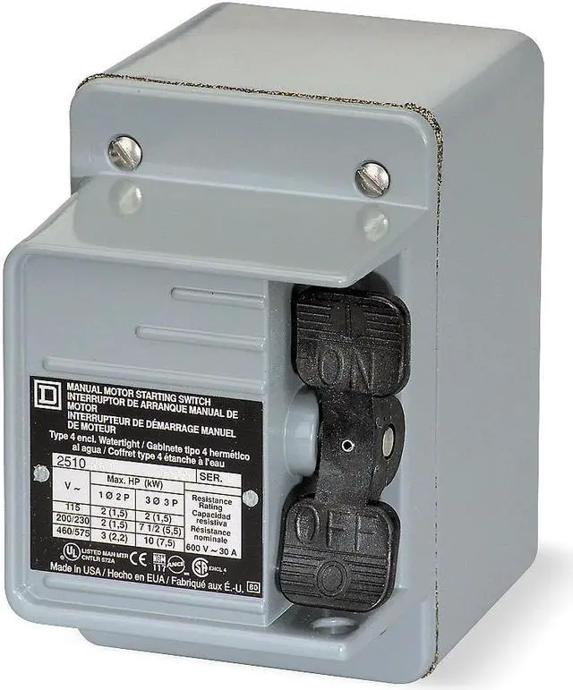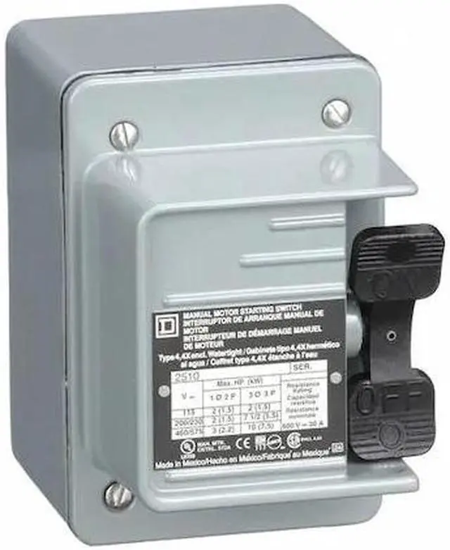 2510K manual motor switches are Intended for industrial, commercial and residential applications. These switches are for applications where overload protection is not required or is provided separately. Manual motor switches provide manual On Off control of small motors. They are designed for single or three phase AC motors. This nonreversing manual switch is toggle operated. The maximum operational voltage is 600 VAC and 250 VDC. This three pole switch is rated for 2 HP at 115VAC, 7.5 HP at 230VAC, 10 HP at 460VAC, 10 HP at 600VAC single phase, 1 HP at 90 VDC, 2 HP at 115 VDC and 1.5 HP at 230 VDC and 30A continuous. The screw clamp terminals will accept 14 to 10 AWG copper wire. This switch has no pilot light indicator. A NEMA 4 watertight and dusttight die cast zinc alloy enclosure is used to protect this manual motor switch. This enclosure has one conduit entry on the bottom. The 0.75 inch conduit entry is tapped with number 14 pipe threads. This device is 4.38 inches tall, 3.00 inches wide and 4.25 inches deep. A toggle handle is used to turn the manual starter on and off. The toggle handle can be padlocked in the off position. This device is UL Listed and CSA certified.