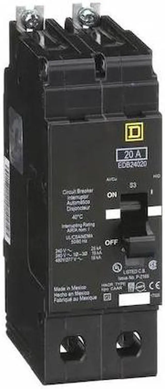 Miniature Circuit Breaker, Amps 20 A, AC Voltage Rating 277/480V AC, Circuit Breaker Type Standard, Number of Poles 2, DC Voltage Rating Not Rated, Circuit Breaker Actuator Toggle, Circuit Breaker Mounting Style Bolt On, Compatible Panelboard/Load Center Series NF, Phase Single, Series EDB, Max. AIR Rating 18kA at 277/480V AC, For Use With Square D NF Panelboards, Terminal Connection Lug, Frame Size 125A/EDB, Length 5.66 in, Width 1.96 in, Depth 4.05 in, Max. Operating Temp. 104 Degrees F.