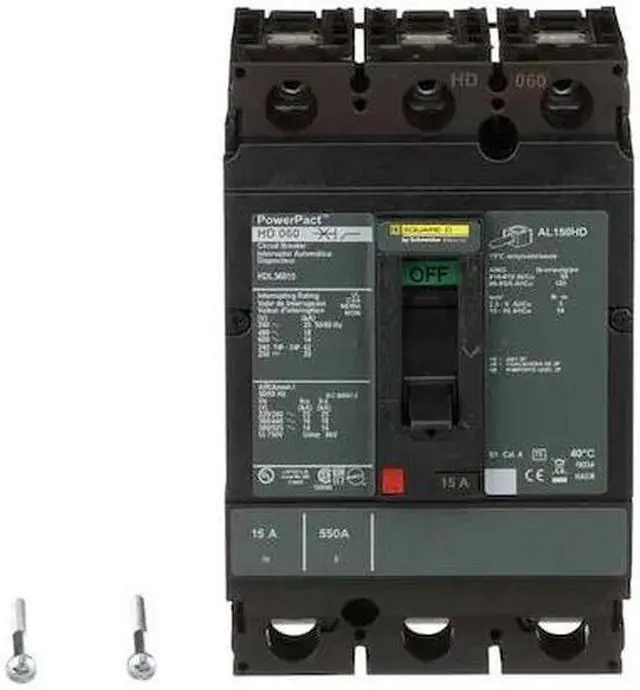 Molded Case Circuit Breaker, 15 A Amps, AC Voltage Rating 600V AC, Max. AIR Rating 25kA at 240V AC, For Use With -, Series HD, High Amp Trip Setting 750 A, Low Amp Trip Setting 350 A, Circuit Breaker Type Standard, Number of Poles 3, DC Voltage Rating 250V DC, Terminal Connection Line/Load Lug, Trip Type Thermal Magnetic, Phase Three, Instantaneous Trip Fixed, Phase Connection ABC, Frame Size 150A/HD, Circuit Breaker Mounting Style Free Standing, Height 6.4 in, Width 4.12 in, Depth 4.36 in.