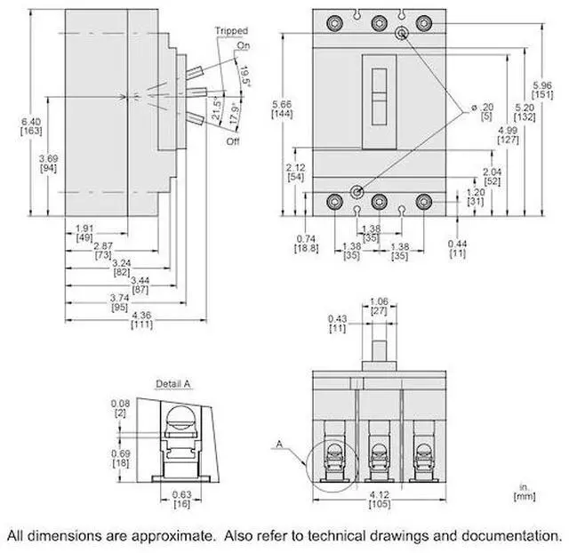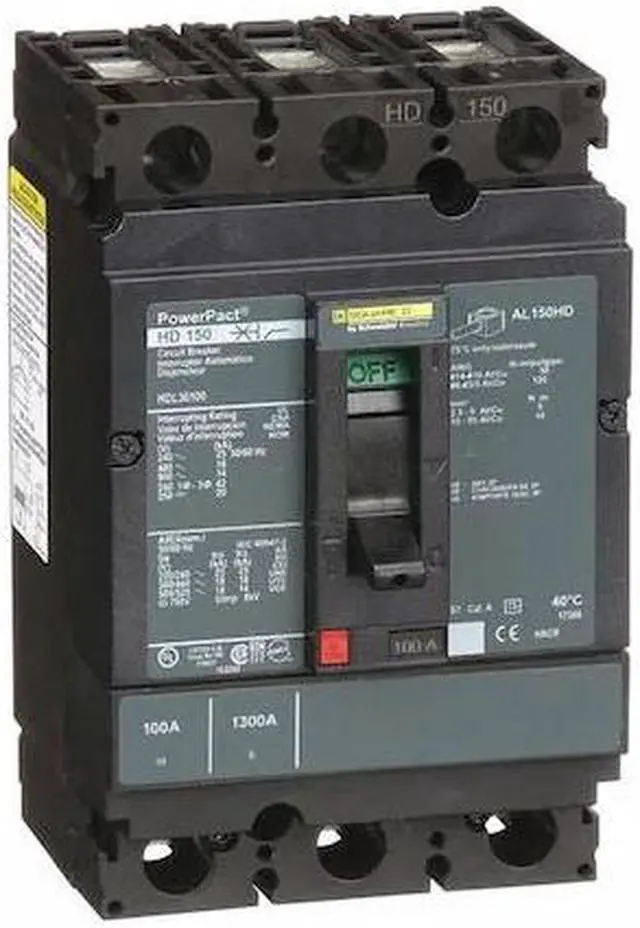 Molded Case Circuit Breaker, 100 A Amps, AC Voltage Rating 600V AC, Max. AIR Rating 25kA at 240V AC, For Use With -, Series HD, High Amp Trip Setting 1, 700 A, Low Amp Trip Setting 900 A, Circuit Breaker Type Standard, Number of Poles 3, DC Voltage Rating 250V DC, Terminal Connection Line/Load Lug, Trip Type Thermal Magnetic, Phase Three, Instantaneous Trip Fixed, Phase Connection ABC, Frame Size 150A/HD, Circuit Breaker Mounting Style Free Standing, Height 6.4 in, Width 4.12 in, Depth 4.36 in.