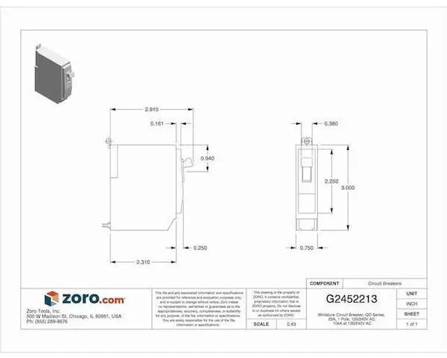 Miniature Circuit Breaker, Amps 25 A, AC Voltage Rating 120/240V AC, Circuit Breaker Type Standard, Number of Poles 1, DC Voltage Rating 48V DC, Circuit Breaker Actuator Paddle, Circuit Breaker Mounting Style Bolt On, Compatible Panelboard/Load Center Series QO, Phase Single, Series QOB, Max. AIR Rating 10kA at 120/240V AC, For Use With Square D NQOD Panelboards, Terminal Connection Pressure Plate, Frame Size 100A/QO, Length 3 in, Width 0.75 in, Depth 2.91 in, Min. Operating Temp. 77 Degrees F.