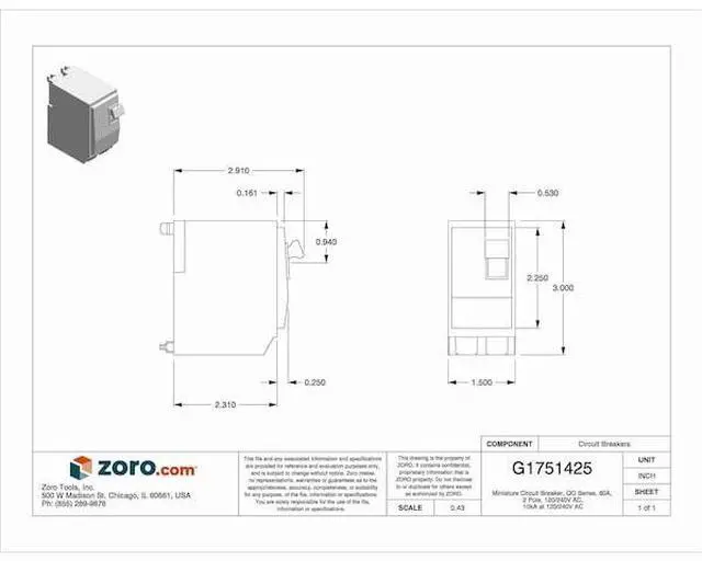 Miniature Circuit Breaker, Amps 60 A, AC Voltage Rating 120/240V AC, Circuit Breaker Type Standard, Number of Poles 2, DC Voltage Rating 48V DC, Circuit Breaker Actuator Paddle, Circuit Breaker Mounting Style Bolt On, Compatible Panelboard/Load Center Series QO, Phase Single, Series QOB, Max. AIR Rating 10kA at 120/240V AC, For Use With Square D NQOD Panelboards, Terminal Connection Lug, Frame Size 100A/QO, Length 3.12 in, Width 1.5 in, Depth 2.91 in, Min. Operating Temp. 77 Degrees F.