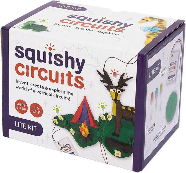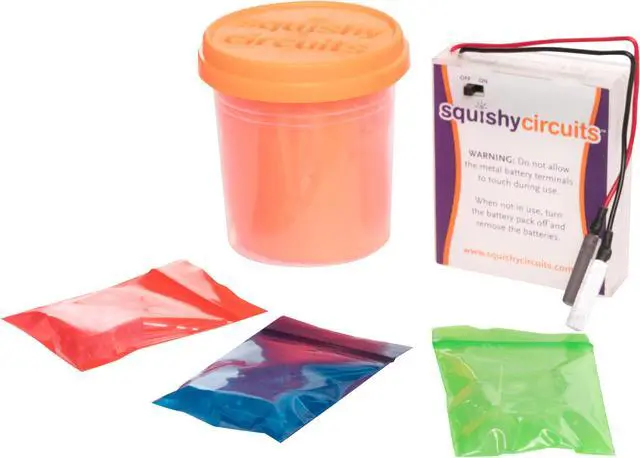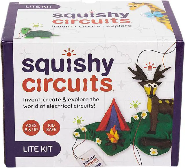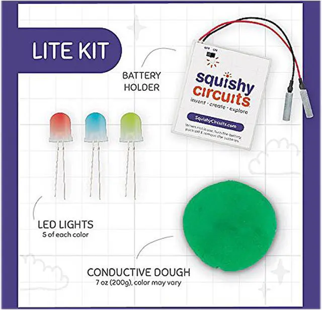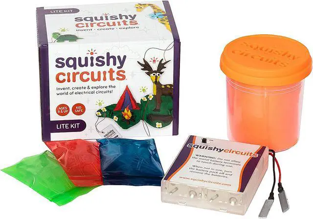 | Features | The most basic of the Squishy Circuits kits, the Lite Kit includes everything junior scientists need to explore engaging electronics principles and light up the room with a playful, squishy circuit! Ideal for classrooms or maker camps, Squishy Circuits are the easiest way to get kids exploring the fundamental principles, properties and possibilities of basic circuitry as early as 8 years old! While making and molding with conductive, insulating play dough they’ve fashioned themselves, kids are exposed to all the basics of electrical circuits in a fun and hands-on way. Just add batteries to Squishy Circuits’ pre-made dough to display interactive LED light-ups or make your own dough with step-by-step recipes! Kids can spark instant life into handmade structures with creatively placed LEDs, buzzers and motors, making Squishy Circuits an all-inclusive learning experience built on versatility! |