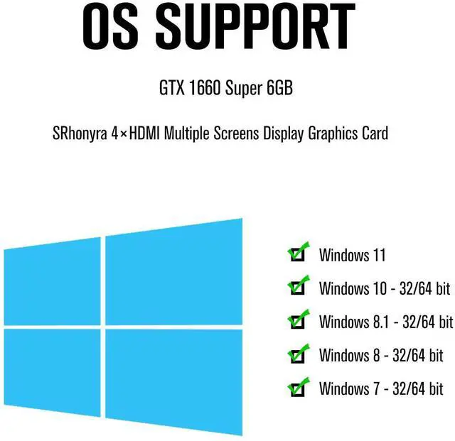 This SRhonyra 4HDMI multipe display video card is made by GTX 1660 Super paired with 6gb GDDR6 VRAM, decent 1080P graphics card for video wall project or quad setup. Total TDP 120 Watts, PSU recommended Min 300 Watts, great to make it as media player, HTPC or stock trading desktop PC.