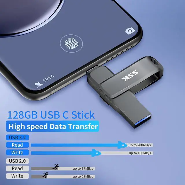 Faster Transfer Speed:SSK 128GB usb c 3.2 stick is up to 200 MB/s read speed and 100 MB/s write speed ,which is 3X faster than normal USB 3.0 external storage sticks. Transferring 1GB files within 5 seconds, SSK black portable USB C pendrive,a preferred USB C thumb drive for daily life and work
