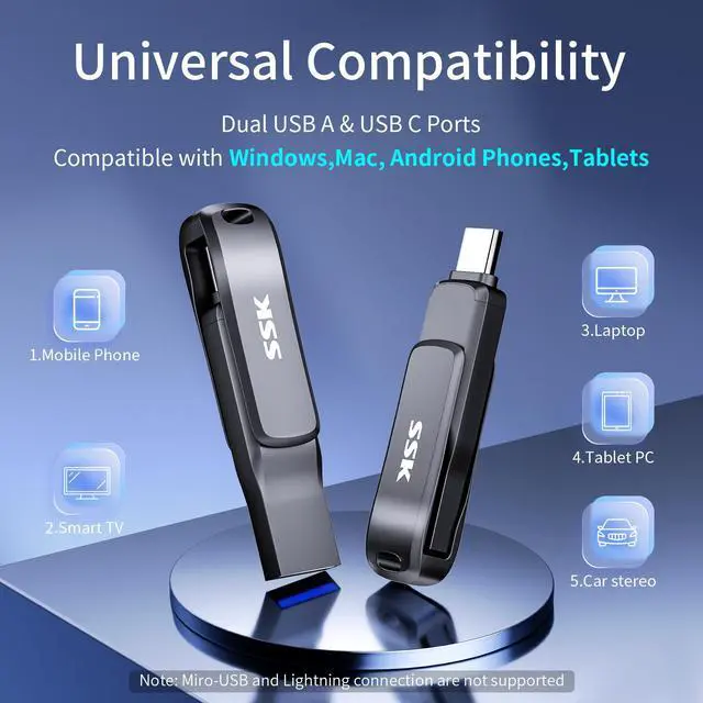 Wide Compatibility: SSK mini usb c pendrive is compatible with computers, laptops, cars audio system, smart TVs, OTG enabled Android Type C phone, tablet. Tips: The Windows Computer 1G=1024M, USB Flash Drive 1G=1000M, so the USB Flash Drive's Capacity Displayed on the Windows OS Computer is about 90% of the Actual Identification. 128GB116GB .Full Capacity is displayed on Mac OS computer(In MacOS system,1G=1000M)