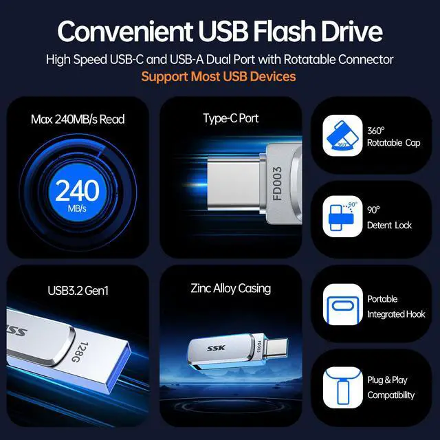 SSK 128GB Flash Drive USB C Thumb Drive up to 240 MB/s, Dual USB FlashDrive USB-C and A 3.2, Zinc Pendrive Memory Stick for iPhone 15/16Pro/Win/Android OTG with Water, Dust, and Drop Resistance