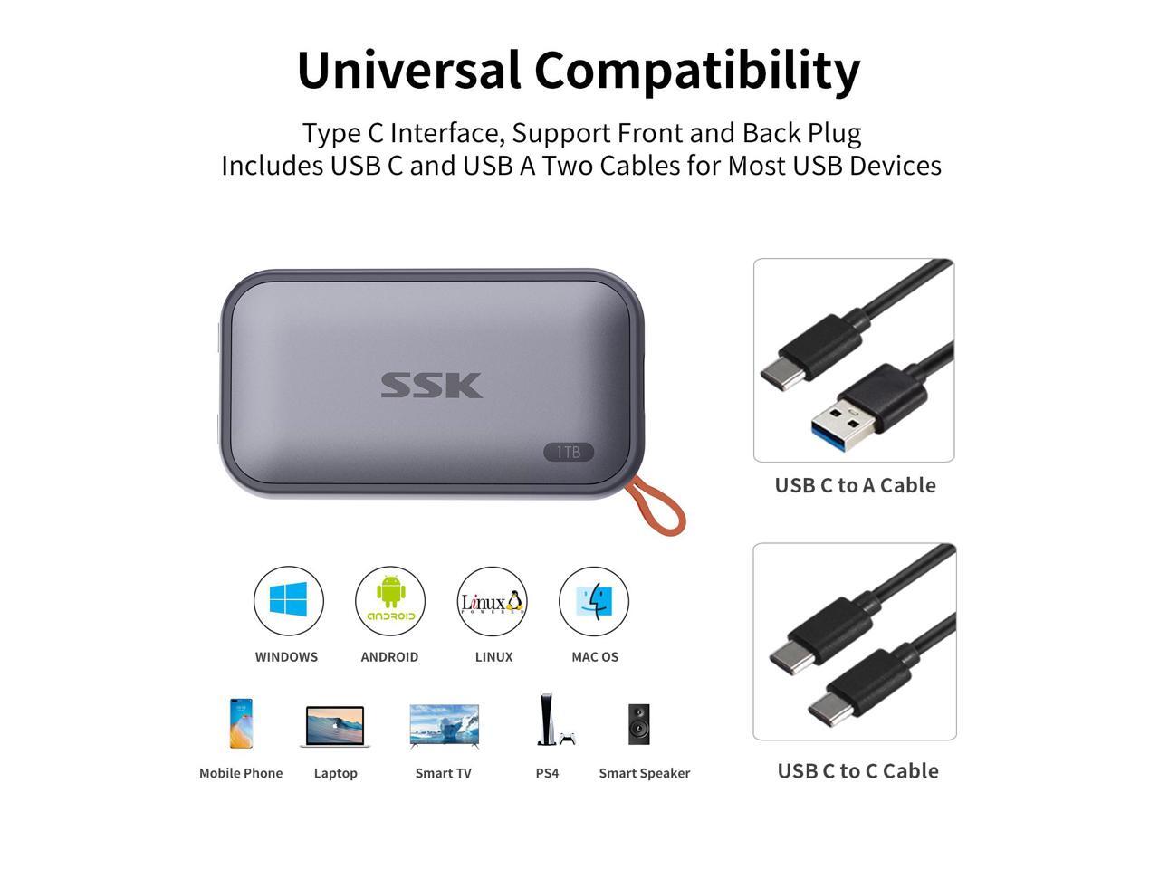 - Universal Compatibility: Support Windows, MacOS, Linux, Android. This external solid state drive includes USB C to A cable and USB C to C cable, So the SSD is not only applicable to conventional USB A port computer devices, but also suitable for USB C smart phones,PS5,xBOX,Laptops and macbook ect.It is backward compatible with USB3.0/USB2.0;