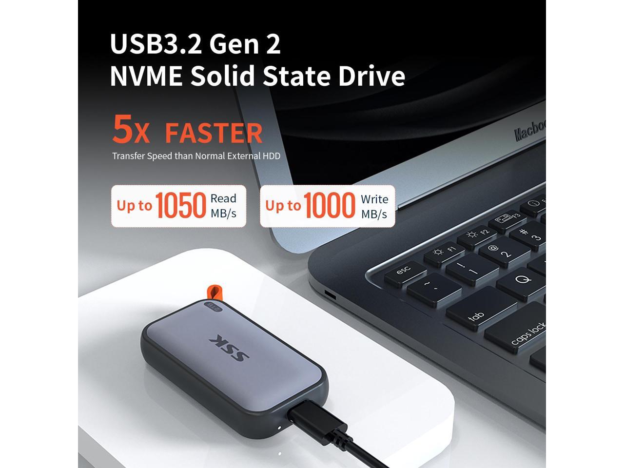 - Extreme Portable NVME SSD: SSK NVMe Solid State Drive performance featuring up to 1050MB/s read and 1000MB/s write speed, transfer massive files in seconds.Let you move hi-res photos and videos fast (Actual speed depending on drive capacity, host device, OS and application);
