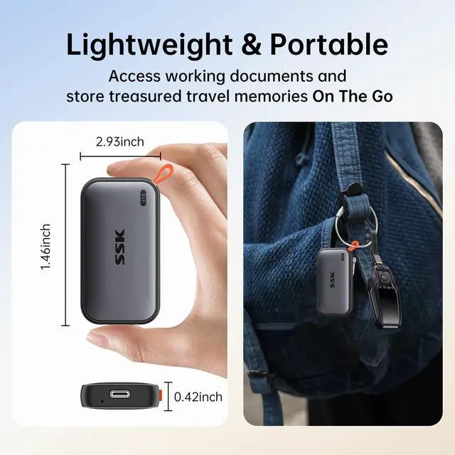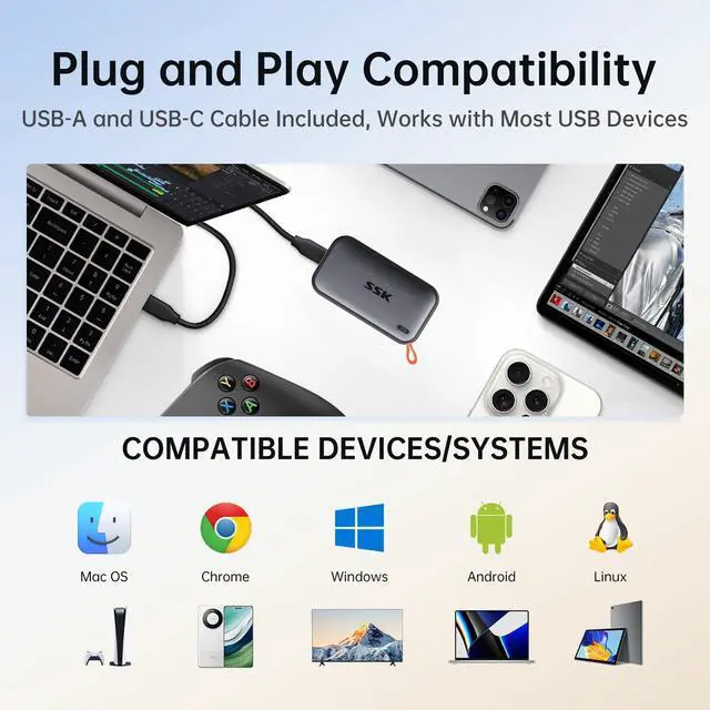 - USB-C + USB-A Dual Connectivity: This portable SSD includes both USB-C and USB-A cables for effortless cross-platform transfers. Easily transfer files bewteen Phone, PC, camera, gaming hostno adapters or software needed