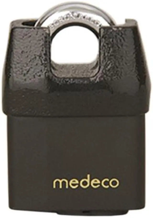Medeco 54-72500-00 54 System Series All Weather 7/16" x 3/4" Padlock With High Security 00 Original Keyway, specially designed for a multitude of applications, and it has a distinctive body style with a shrouded shackle. This padlock utilizes a baron alloy steel shackle which provides protection to resist cutting and increased tensile strength to resist pulling attacks. The baron alloy steel ensures that the shackle has an exceptional degree of ductility and it is not brittle. The cylinder in this padlock is constructed of durable machine brass components, and it has hardened stainless steel inserts to provide the ultimate defense against drilling, pulling, and other forms of vandal attacks. The Medeco unique design provides triple locking action, making the lock virtually pick proof. All Medeco keys and locks are protected under patent, trademark, and copyright laws. This padlock comes in a standard black body cover and the cylinder is furnished in the satin brass finish.