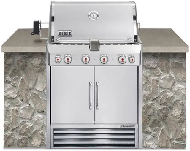 | Description | Cooking System 4 Stainless steel burners 48,800 BTU-per-hour input 8,000 BTU-per-hour smoker burner and stainless steel smoker box 10,600 BTU-per-hour infrared rear-mounted rotisserie burner Spit fork rotisserie attachment with heavy-duty motor Snap-Jet individual burner ignition system 3/8 inch or 9.5mm diameter stainless steel rod cooking grates Stainless steel Flavorizer bars Primary cooking area = 468 sq. in. Warming rack area = 112 sq. in. Total cooking area = 580 sq. in. Tank not included with LP models 1 Grill Out handle lights Weber cookbook Construction Stainless steel shroud with polished handle and trim, a center-mounted thermometer and accent-colored, cast-aluminum end caps Enclosed storage area with stainless steel doors and bottom shelf Stainless steel frame Slide-in installation design Fuel gauge, tank mounting kit, hose and regulator included: tank is not included (LP models) See Accessories Tab for Additional Accessories |