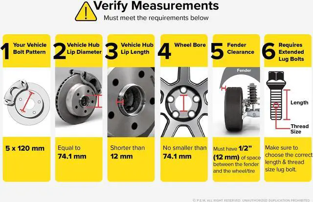 - [VERIFY FITMENT] Even if a vehicle is listed as compatible, buyers still need to check: 1) You have 1/2" (12mm) of space between your fender and your wheel/tire; 2) Your studs/bolts are the correct length to ensure safe nut/bolt thread engagement; 3) For proper installation you may need aftermarket Extended Lug Bolts or Extended Wheel Studs (NOTE: NOT INCLUDED with this listing); 4) Wheel bore needs to be no smaller than 74.1mm.