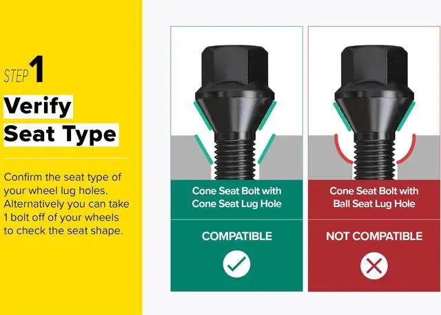 - WARNING: VERIFY VEHICLE LUG BOLT SIZE, SEAT AND THREADS. Check your vehicle's bolt thread size, as various years/models come with different size bolts. These are Cone Seat (60 Degree Taper) shaped bolts. Make sure your wheels bolt seat have this seat type. See Diagram for Help. During Installation, ensure that your bolts get 5-8 full turns before tightening.