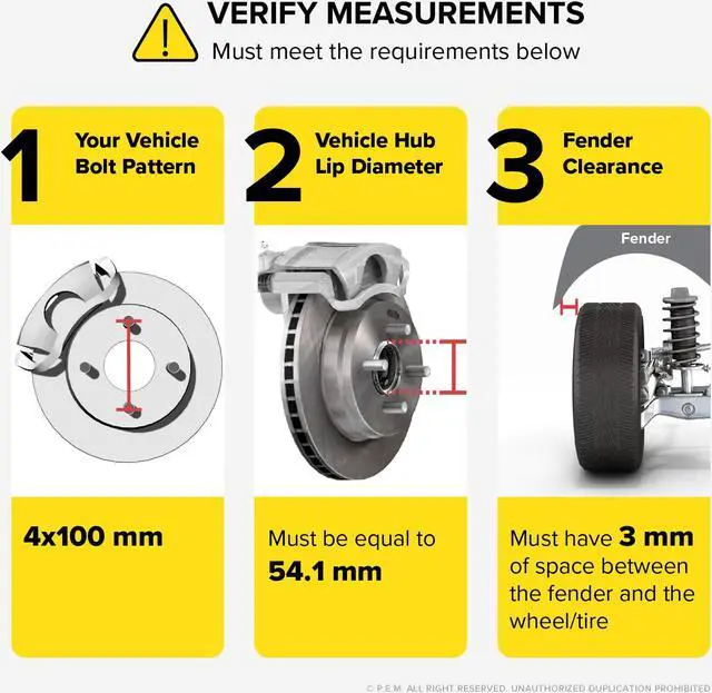 - [VERIFY FITMENT] Even if a vehicle is listed as compatible, buyers still need to check: 1) You have 3mm of space between your fender and your wheel/tire; 2) Your studs/bolts are the correct length to ensure safe nut/bolt thread engagement; 3) For proper installation you may need aftermarket Extended Lug Bolts or Extended Wheel Studs (NOTE: NOT INCLUDED with this listing); 4) Wheels will center around vehicle's hub lip as long as it is longer than 3mm.