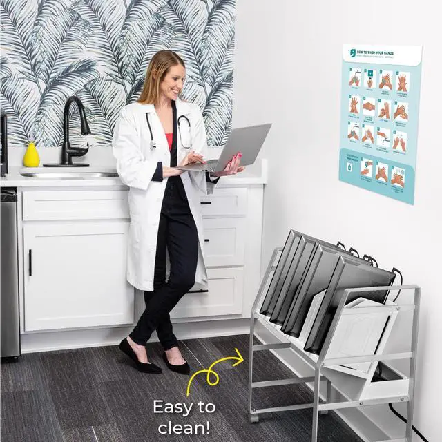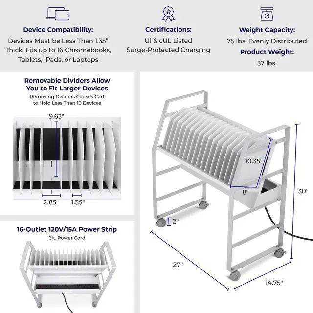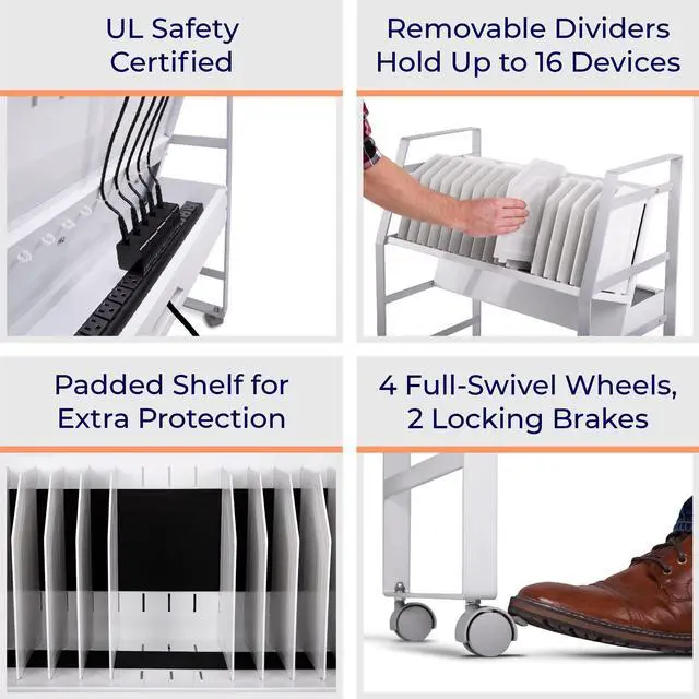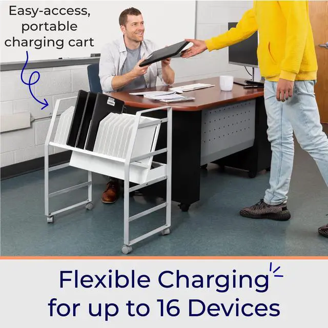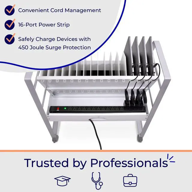 Keep your devices charged and organized on-the-go. Ideal for schools or businesses, the Line Leader mobile charging cart charges up to 16 devices at once. This premium laptop cart features a sleek, compact metal frame with locking wheels for easy storage in any space. A UL safety-certified power strip with surge protection ensures safe charging, while padded charging slots prevent accidental device damage. The laptop cart's open design lets you access your electronics with ease and allows air to circulate freely to keep devices cool.
