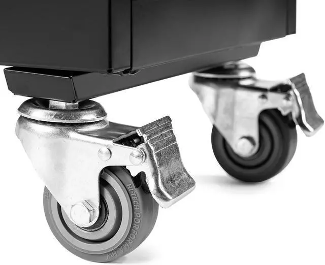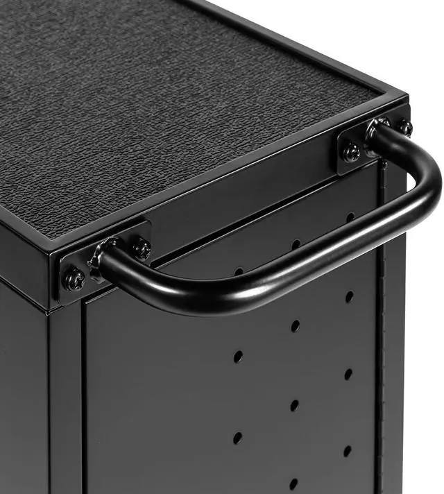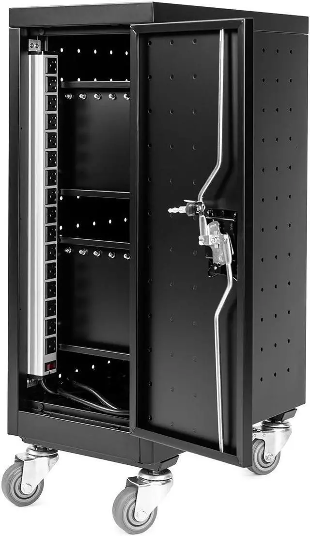 Features We Love: Non-Skid Padded Top Surface Sleek Powder Coated Steel Finish Rubber Coated Dividers Ventilated Side Panels Four 3-inch, Swivel, Non-Marring Casters Two Casters with Locking Brakes Front and Rear Locking Doors UL-Listed 16 Outlet Vertical Power Strip Additional Space on Bottom Shelf for Cord