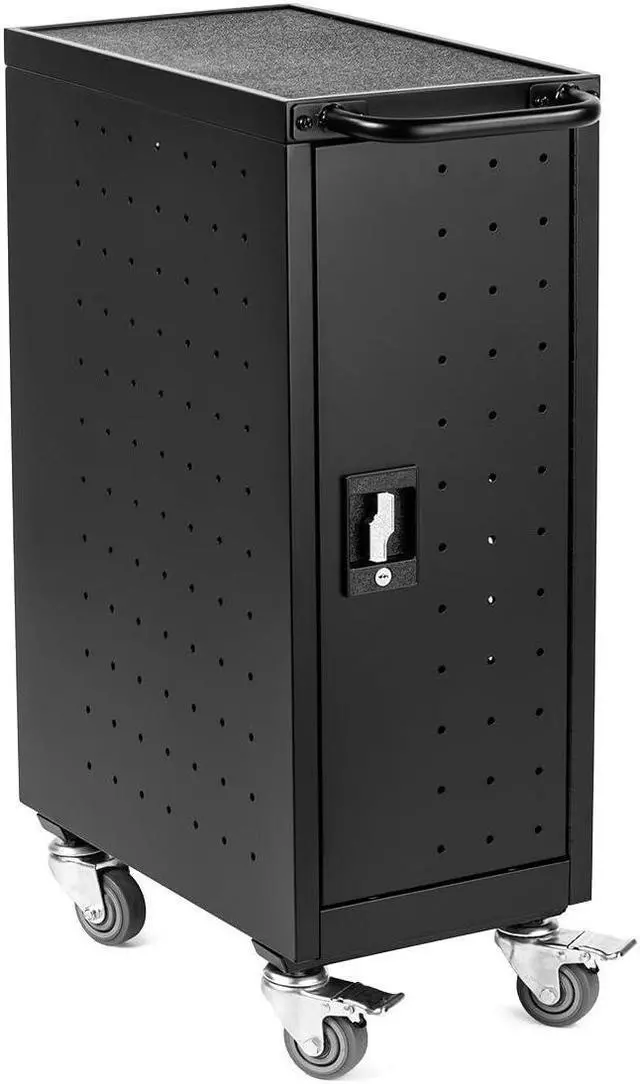 Don't be fooled by its small size! You will be amazed by how much our sleek, compact, versatile charging cart can do. This lustrous cart allows you to store, charge, and transport your office/classroom devices with confidence. The cart is completely safe and comes with 4 keys for its' front and back locking doors. After super easy assembly, use the convenient grab handles to maneuver with its heavy duty 4-inch non-marring casters. All side panels are ventilated, and dividers are rubber coated to protect up to 16 devices! Our cabinet is sturdy and long lasting with its all-steel construction and durable powder finish.