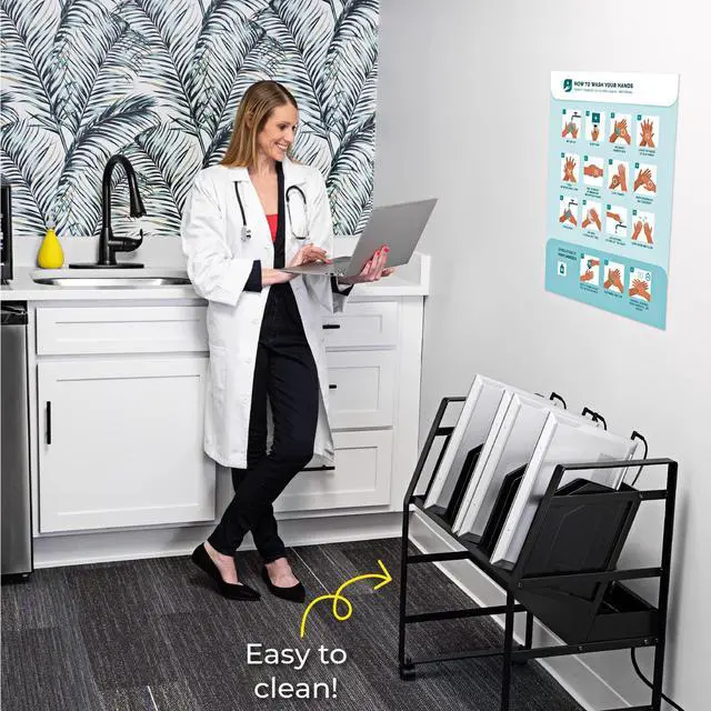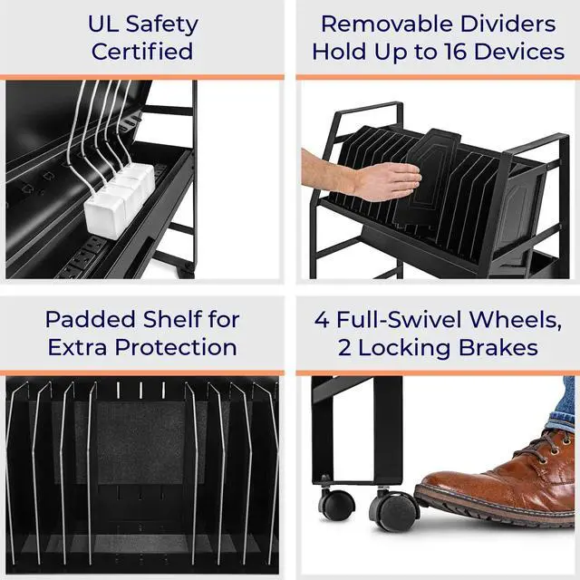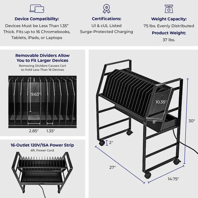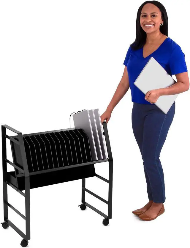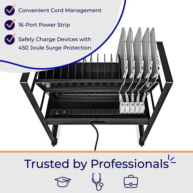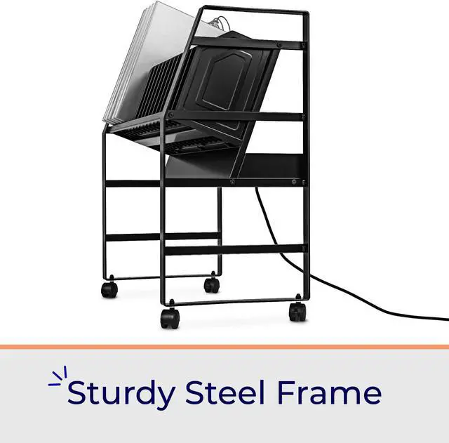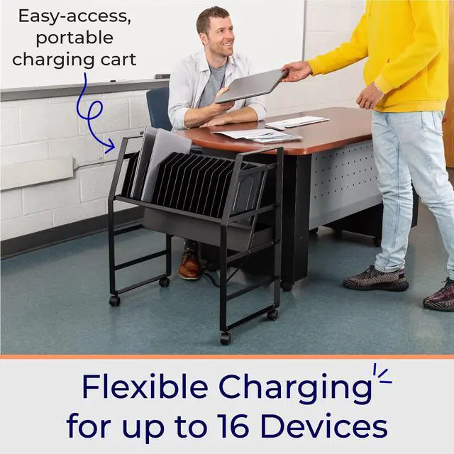 Keep your devices charged and organized on-the-go. Ideal for schools or businesses, the Line Leader mobile charging cart charges up to 16 devices at once. This premium laptop cart features a sleek, compact metal frame with locking wheels for easy storage in any space. A UL safety-certified power strip with surge protection ensures safe charging, while padded charging slots prevent accidental device damage. The laptop cart's open design lets you access your electronics with ease and allows air to circulate freely to keep devices cool.