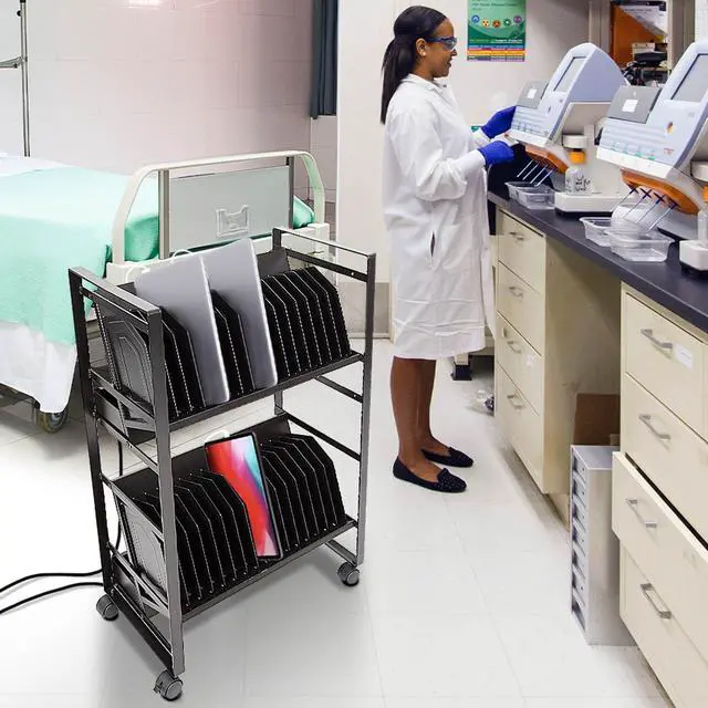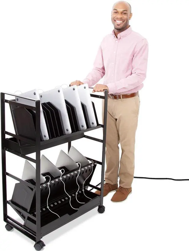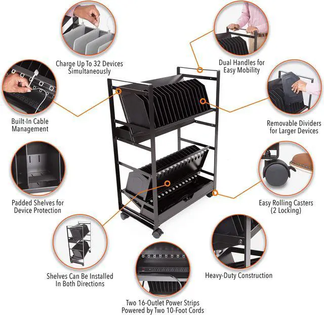 FEATURES WE LOVE: 32 Device Charging Capacity | Durable Steel Construction | Cable Management Clips | Reversable Open Concept Design | Non-Marring Wheels | Locking Casters | 10-Foot Power Cords with Surge Protection | Full Certification for UL 60950-1 / cULus Safety Standards