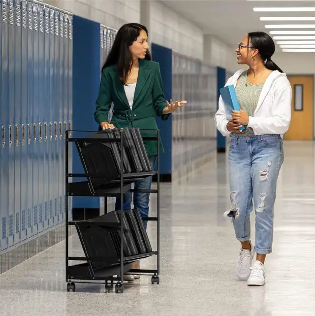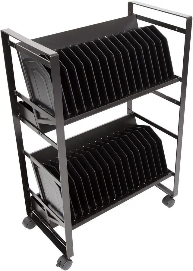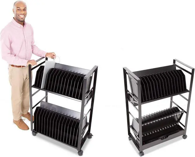 The open-concept design of the cart features 32 padded dividers that can be removed to fit larger devices. When setting up your cart, you can install the top shelf to face the same direction as the bottom shelf or install it facing the reverse direction for easy access to both sides.
