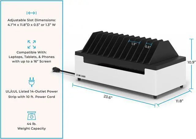 | Features We Love: Tabletop Charging for 12 Devices, Durable Steel Construction, Keeps Cords Hidden, Adjustable Device Dividers, UL Safety Certified, No Assembly Required
