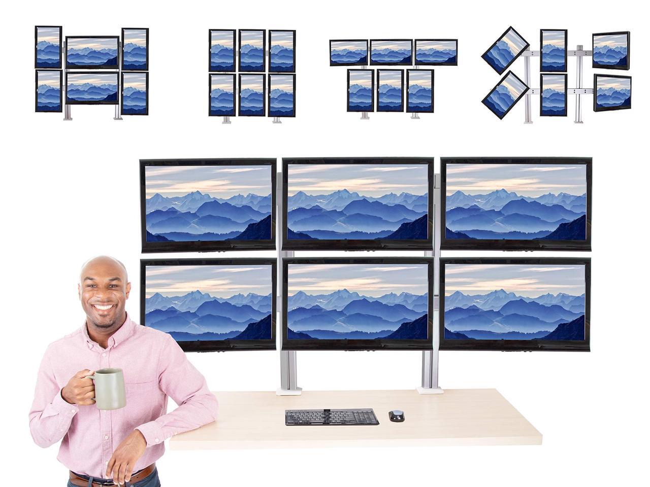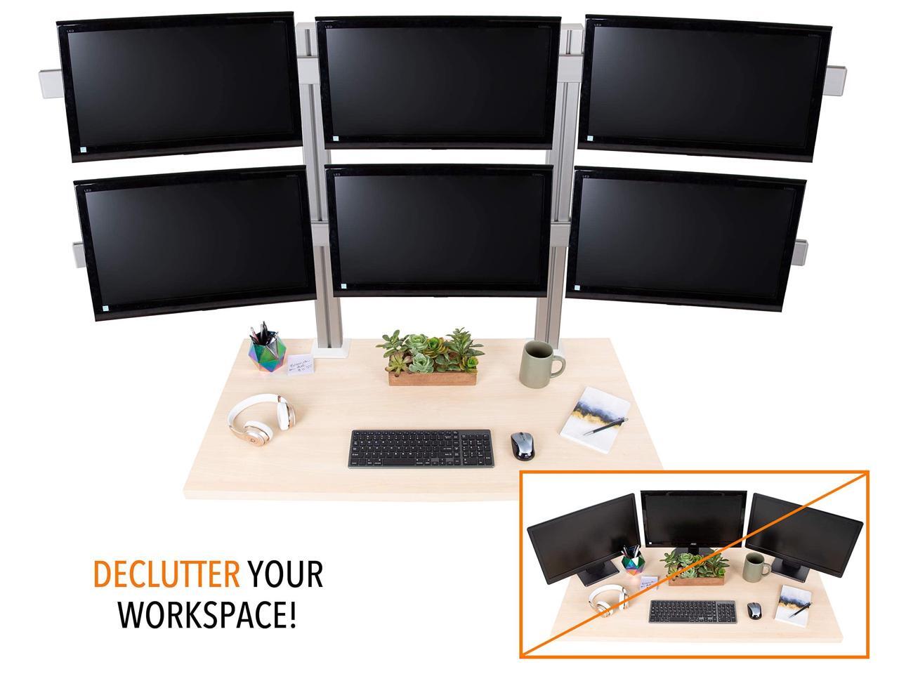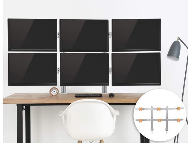 - High-Quality Durability - This sleek and sturdy metal frame monitor stand supports 6 screens, enhancing any workspace with a high-end look. The heavy-duty base attaches securely to your desk, preventing monitor shaking or tilting.