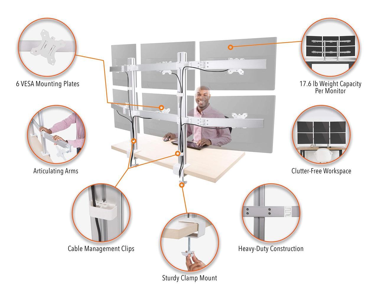 Stand Steady 6 Monitor Mount Desk Setup - Heavy-Duty Height Adjustable Monitor Stand, Swivel Arm with Clamp-On Base, 6 Screen VESA Mount Fits Most LCD/LED Monitors 17-32 in. (Silver, 6 Mounts)