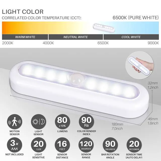 This motion sensor LED light will turns on when a movement is detected in the DARK. It will turn off within 20 seconds after detecting your LAST motion. It is perfect for Cabinet, Closet, Counter, Stairs, Kitchen, Bedroom, Storage room, Hallway, Laundry area, Safe box, Mailbox.