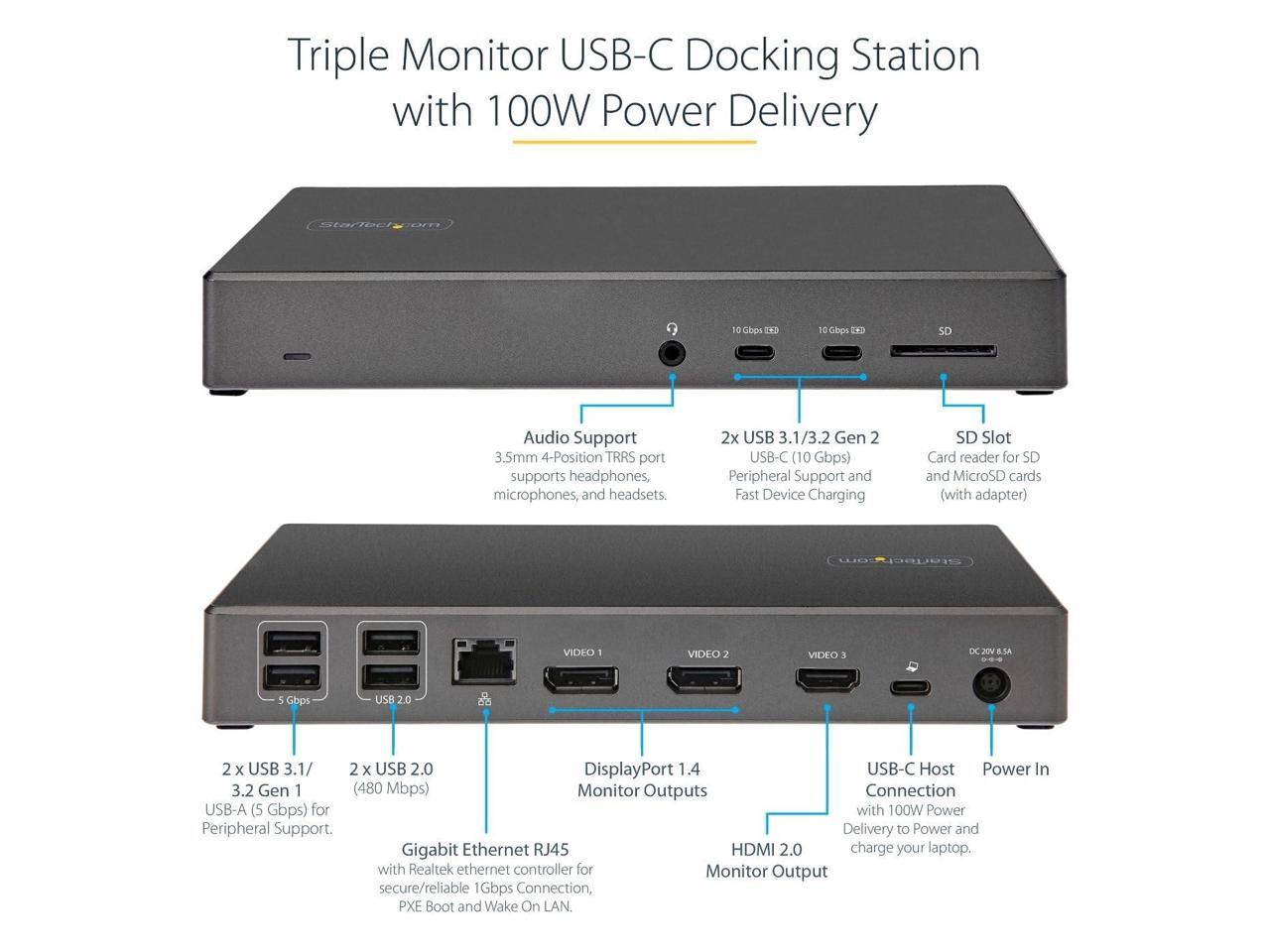 - Triple Monitor Support: Enjoy up to three 4K video outputs with this USB-C docking station, including 2x DisplayPort 1.4 and 1x HDMI 2.0, providing stunning visuals for your work or entertainment.
